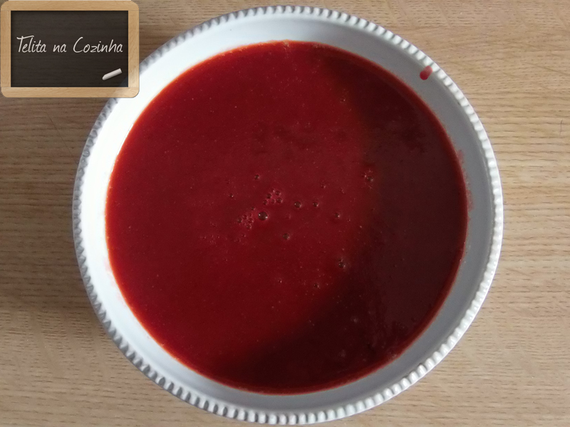 Depois, sem lavar o copo, colocar os restantes ingredientes (natas, cuajada, leite e leite condensado) e programar 15 min/90º/vel 4. No final do tempo, programar a bimby na vel. 2 e ir juntando o coulis de morangos (reservar um pouco para a decoração).