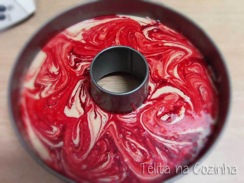 Verter o preparado na forma untada. Deitar, por cima, o corante alimentar e, com uma colher, misturar.
