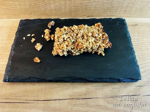 Resolvi-me a fazer barras de cereais caseiras para levar para o trabalho e ter um snack saudável para comer a meio da manhã ou a meio da tarde. Na pesquisa de receitas, encontrei esta da Joana do blog Palavras que enchem a barriga, onde a Joana explica as proporções que se devem respeitar para uma receita de sucesso: 50g de flocos (aveia, farelo de trigo, cevada, arroz ou espelta); 15g de frutos secos (nozes, pistáchios, amêndoas, pinhões, avelãs ou amendoins); 20g de sementes (sésamo, abóbora, girassol ou linhaça); 15g de frutas secas ou desidratadas (maçãs, côco, passas ou sultanas, etc.). Respeitando estas proporções, adicionei mel para unir os cereais e fiquei com tantas ideias para novas combinações!