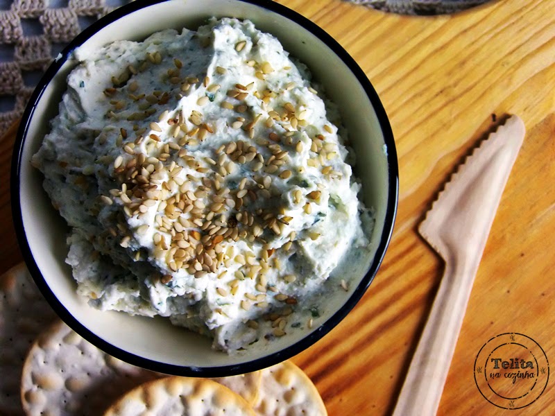 A receita é somente de requeijão com hortelã mas não resisti a juntar nozes e sementes de sésamo a decorar.