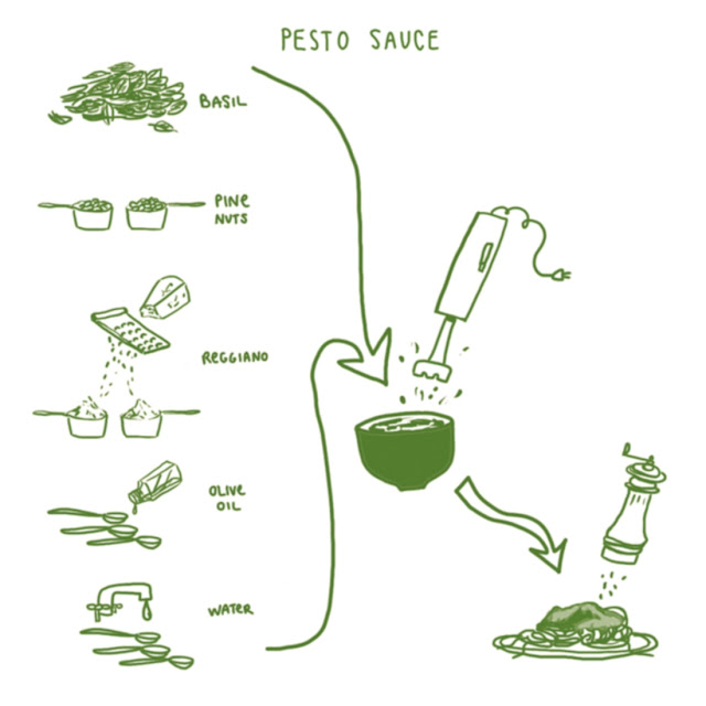 Embora existam variações, o molho pesto é composto de folhas de manjericão amassadas com azeite, pinhões, alho e sal. Após adicionar o molho à massa cozida, adiciona-se uma porção de queijo parmesão ou pecorino.
