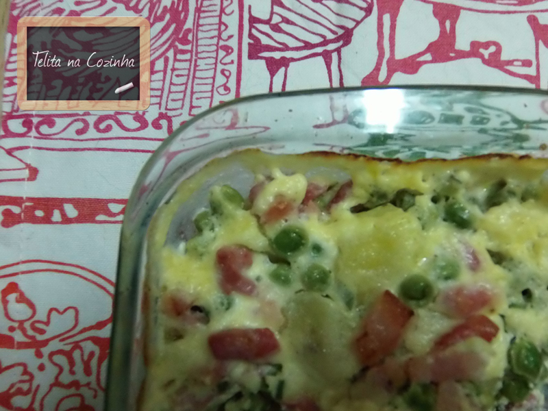 Num pyrex, coloque as batatas e as ervilhas e verta por cima o preparado. Leve ao forno a 200ºC por cerca 20 minutos.