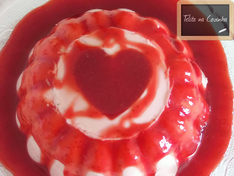 Quando estiver tudo misturado, despejar para uma forma (de silicone) e levar ao frio para solidificar. Quando estiver completamente solidificado, desenformar e decorar a gosto com os morangos e o restante coulis.