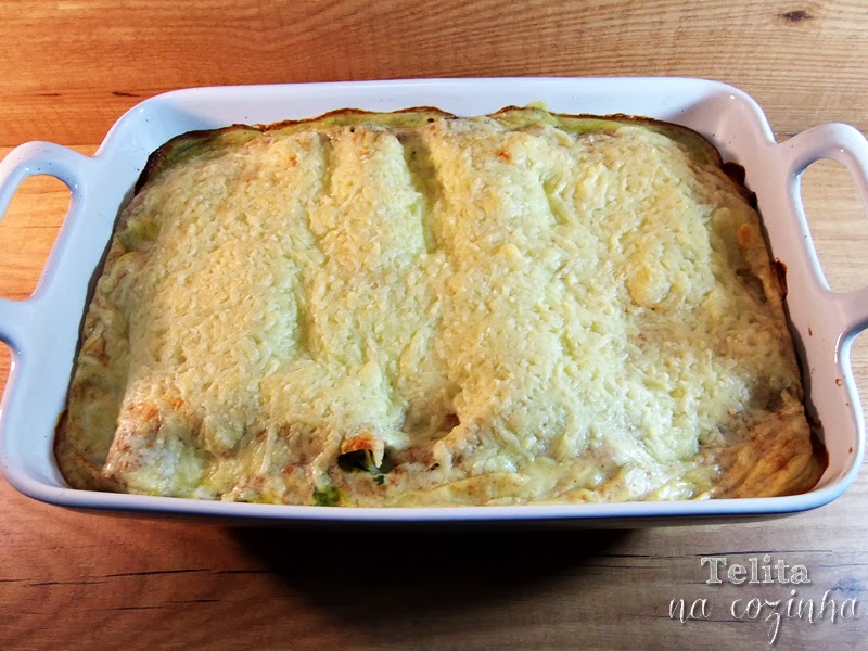 Para o jantar, apetecia-me bacalhau. Apetecia-me um prato de forno reconfortante para ver se me esqueço do frio. Estava para fazer bacalhau com natas mas, como nunca tinha feito lasanha de bacalhau com espinafres, foi desta. Baseei-me nesta receita mas adaptei quantidades e alterei o bechamel. Fiz bechamel com farinha de trigo integral, em vez de farinha normal, porque fica muito mais saboroso.