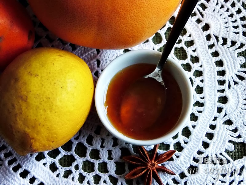 Apesar do doce ser de três citrinos - toranja, laranja e limão - acabei por acrescentar clementinas e uma lima que tinha pele de limão. (Tenho tido a sorte de comprar limões que ao abrir são verdes como as limas.) Mantive mais ou menos as proporções da receita original mas deixou de ser um doce de três citrinos para um doce de cinco citrinos, dois açúcares... e anis! Adoro anis!