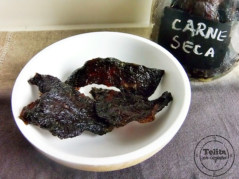 Tendo um desidratador de alimentos em casa, tinha que experimentar a carne seca. Andei a pesquisar receitas para saber como temperar e/ou que cuidados a ter com a carne. Entre muitas, escolhi esta lista e optei pela mais simples. Escolhi marinar a carne com azeite mas pode ser feito com tempero em pó e sem quaisquer líquidos.