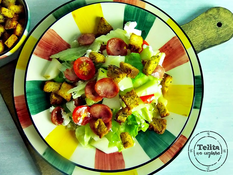 Agora que o Verão acabou é que me tem apetecido saladas e refeições leves. Apesar de o Outono já ter começado, ainda não está frio o suficiente para me apetecer refeições quentes mas apetecem-me sempre refeições reconfortantes e, para mim, estas saladas com tudo e mais alguma coisa são refeições de conforto. Além disso, é uma excelente desculpa para fazer croutons (nos quais eu não estou absolutamente nada viciada) e, se forem feitos com o tempero de alho e salsa, ficam perfeitos!