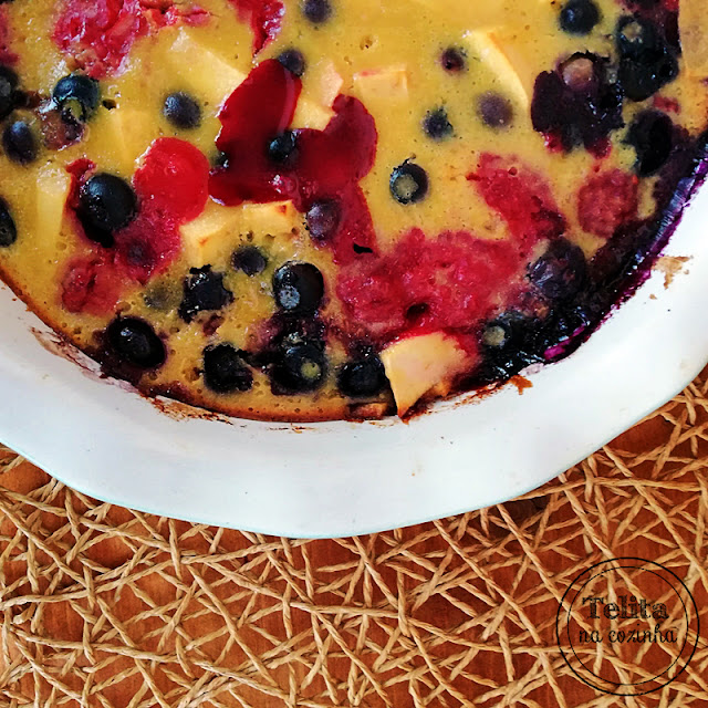 O primeiro que fiz foi de ananás e côco e ficou divinal. O segundo foi de morangos que levei a um jantar em casa de amigos e foi devorado. Também fiz clafoutis de cerejas que igualmente recomendo.